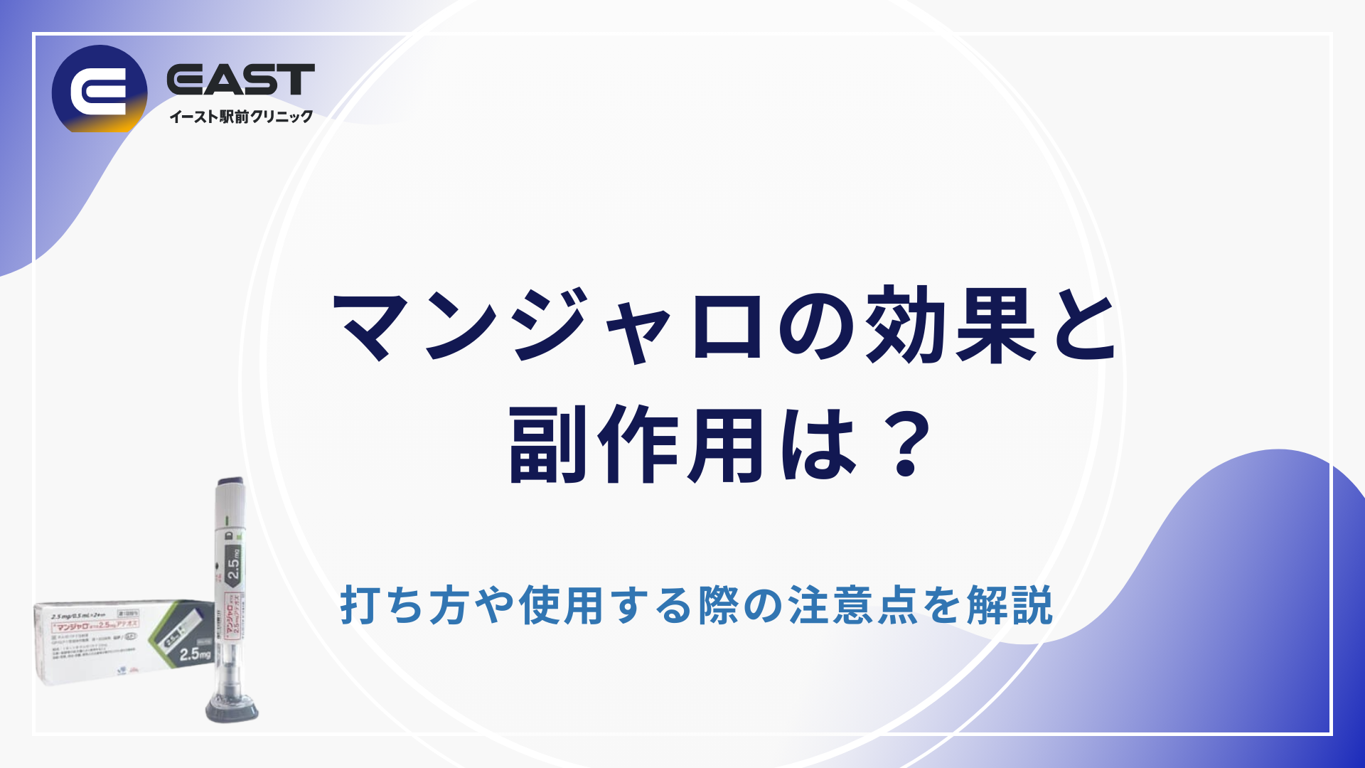 イースト駅前クリニックでは、医師のサポートとともに肥満治療を提供する肥満外来を開設しています。生活習慣の改善に加えて、無理なく理想の体型を目指すことを目的にサポートを実施しており、皮下注射薬のGIP/GLP-1自己注射薬(マンジャロ)をはじめ、経口薬や医療用漢方などを扱っています。
